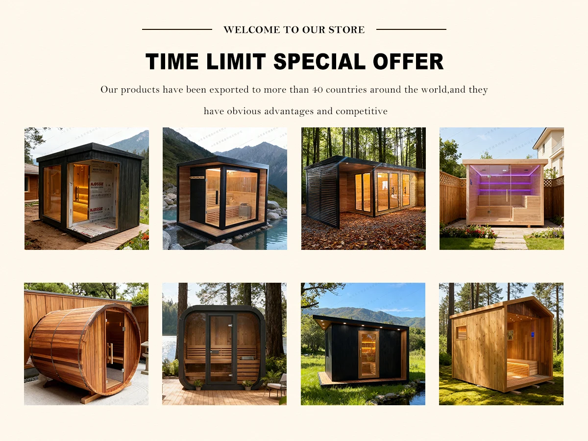 Prodotti principali: Sauna interna/Sauna esterna/Sauna a botte, sauna all'aperto, sauna tradizionale, sauna panoramica, sauna a vapore